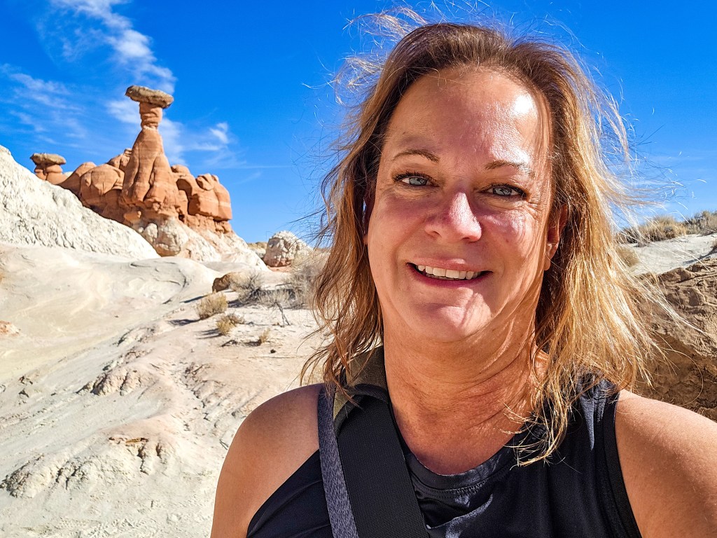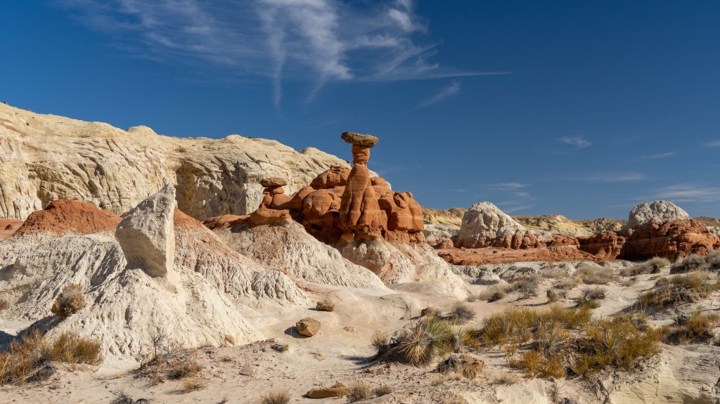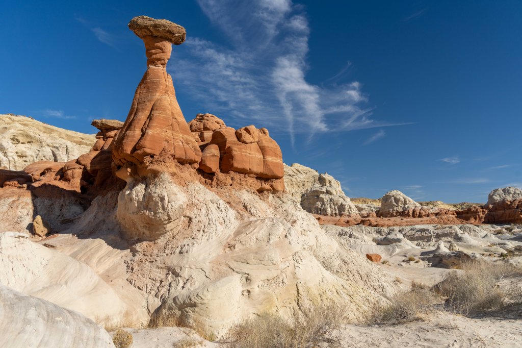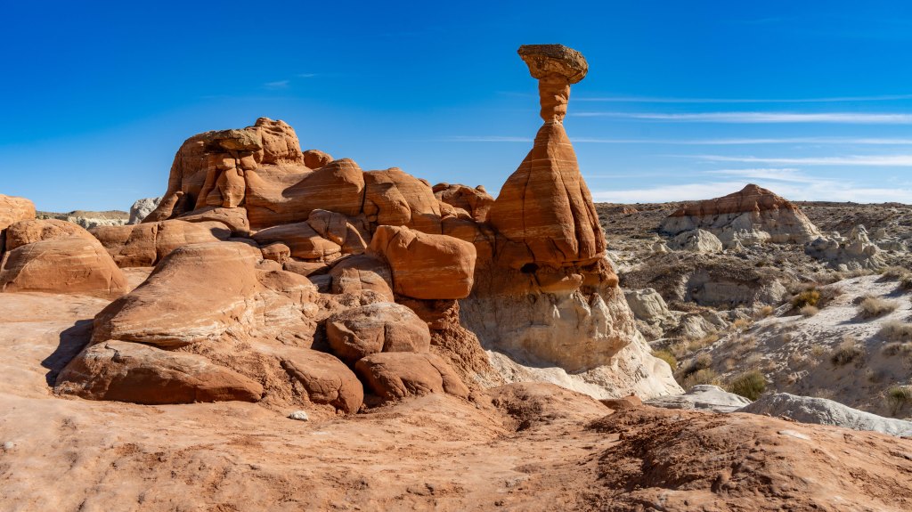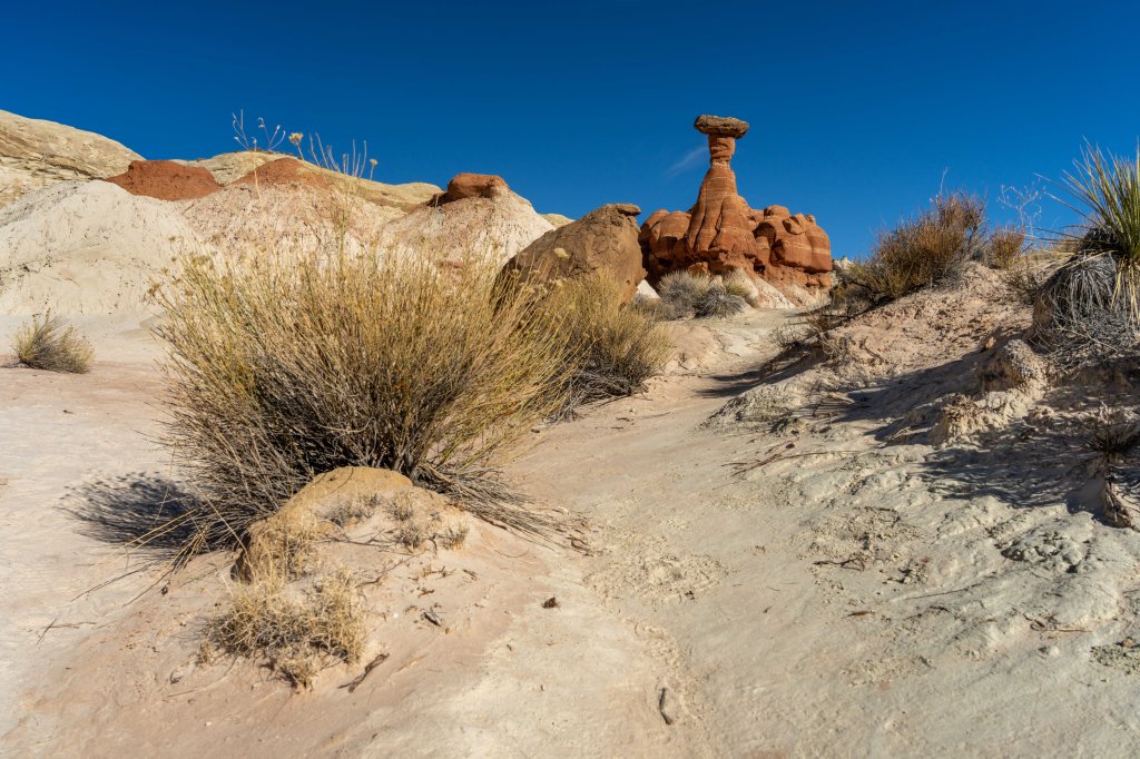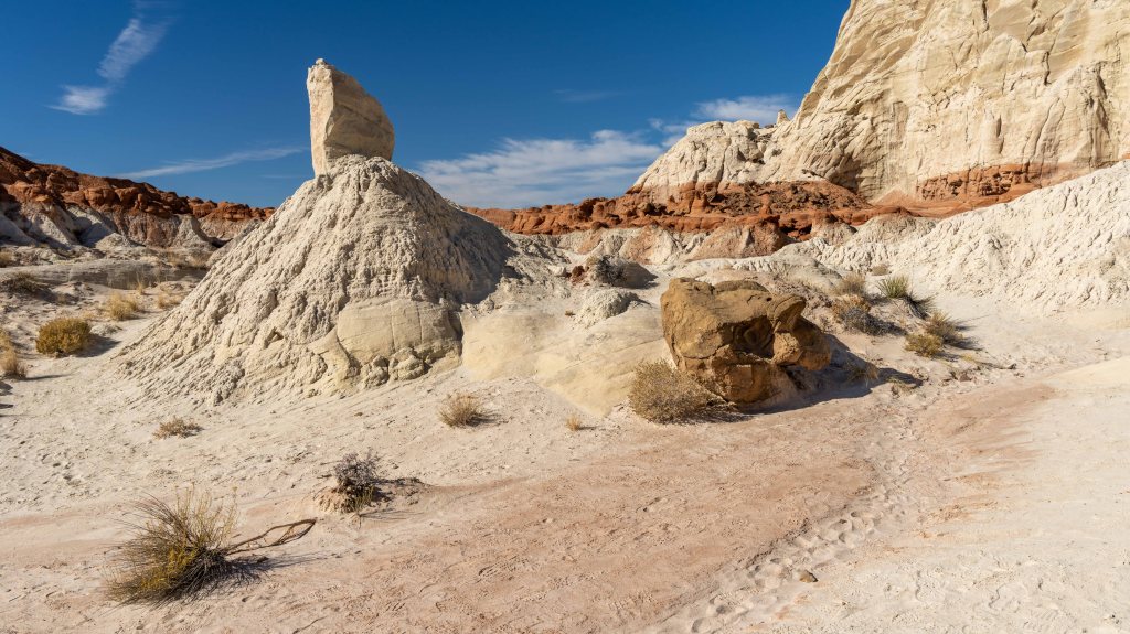 Of course, I had to hike right up to the hoodoo. It’s actually quite large. I loved how the hoodoo was made of red sandstone while the surrounding terrain was made up of white tuft. The tuft is way softer than sandstone, so it erodes much more quickly than the sandstone. It’s amazing how nature’s elements can create such beauty with just wind and water.