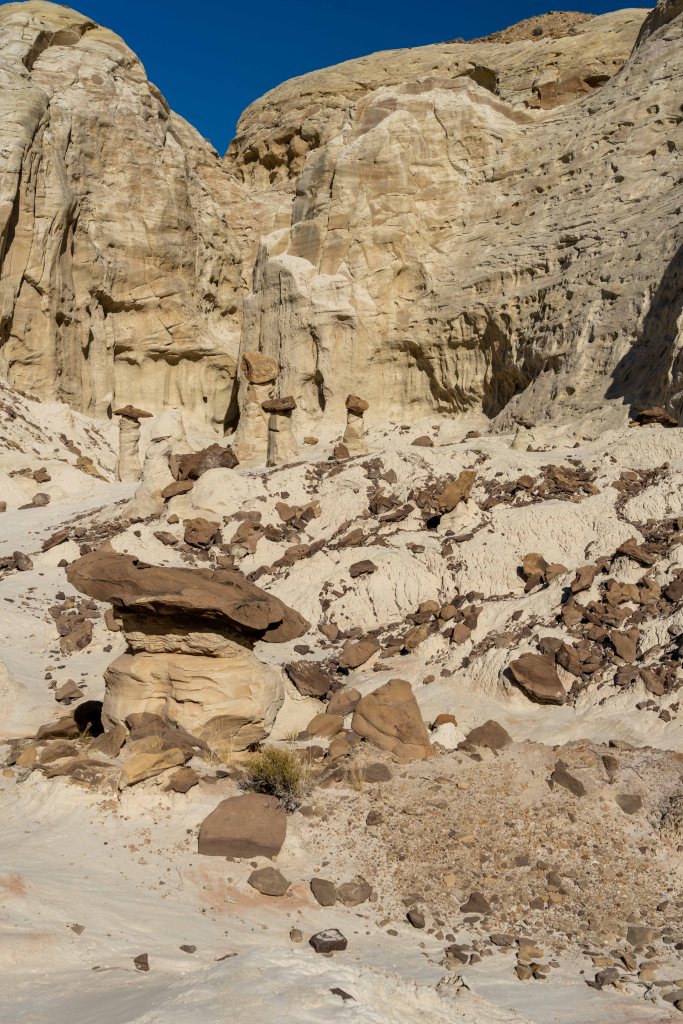 Once I was back at the Toadstool hoodoo, I decided to explore a little more the area behind the hoodoo. I’m glad I did because I happened to notice the unique formation of mushroom hoodoos trailing along the rock wall.