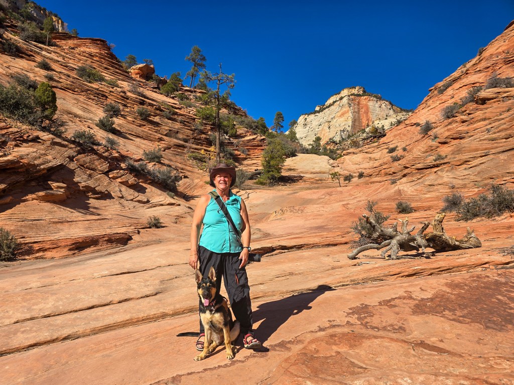 At this point, the trail became too steep for me to climb. So I decided to turn around and head back downhill. I came across a couple climbing up the trail, and I asked them to take a picture of Maddie and me.
