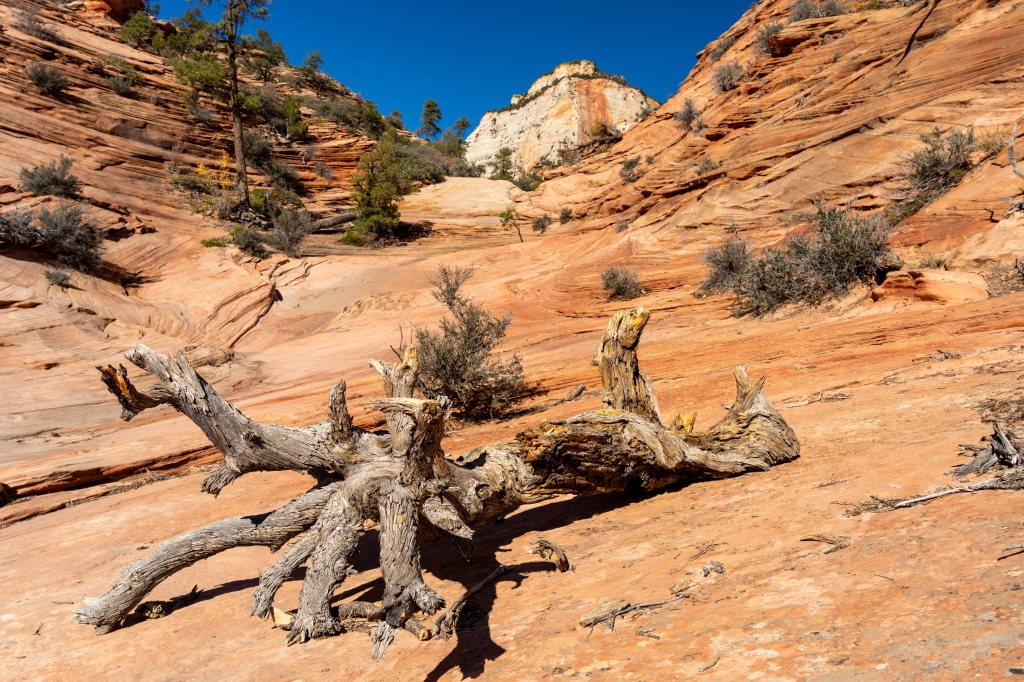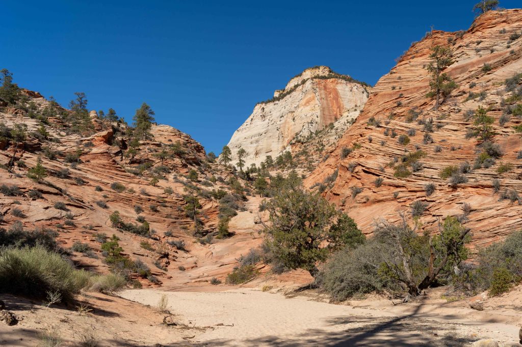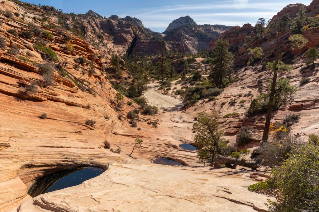 I woke up early the next morning so I could hike the Many Pools Trail in Zion. It’s a trail right off the scenic highway that follows a runoff area that is composed almost entirely out of sandstone. It’s named Many Pools because there are several areas that have been eroded into holes along the slope that catch and hold rainwater.