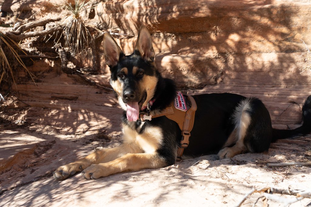 Maddie thought the day was a little too warm after she had been climbing and exploring the trail. She managed to find a small spot of shade to cool off.