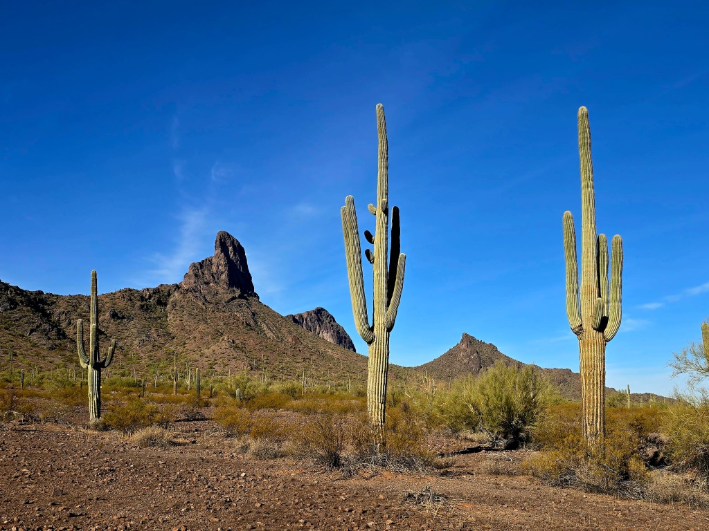The RV park I’m staying at is near an interesting shaped peak called Picacho Peak. There are lots of Saguaro Cactus to walk through in my morning walks.