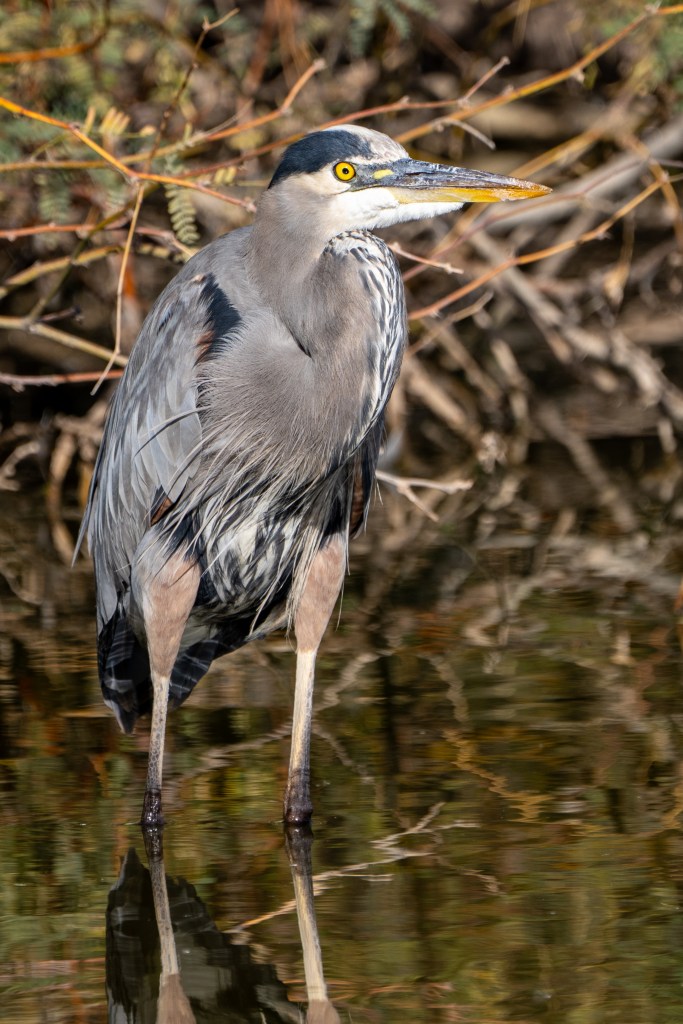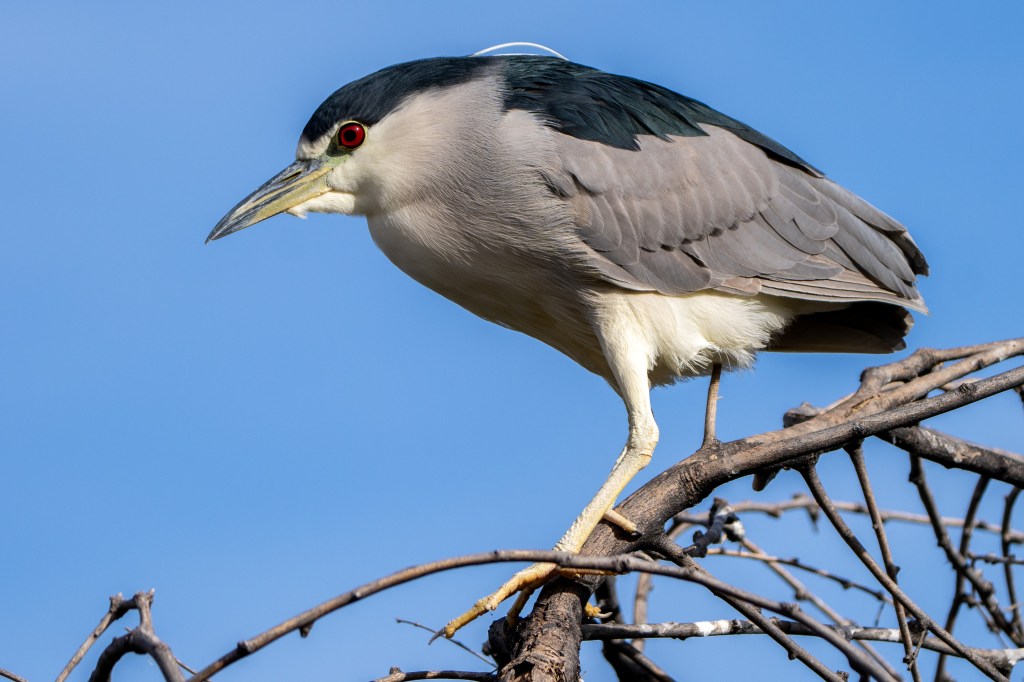 After seeing the most obvious of the birds, I started looking for other birds. I was happy to see lots of Black-Crowned Night Herons roosting in the trees and bushes along the shores of the ponds. They blend in very well with the shadows. But to my delight, one of them was perched right out in the open. I got my best ever photo of this species. You can even see the single white feather that protrudes from the back of their heads. I love the red eyes they have.