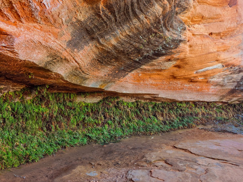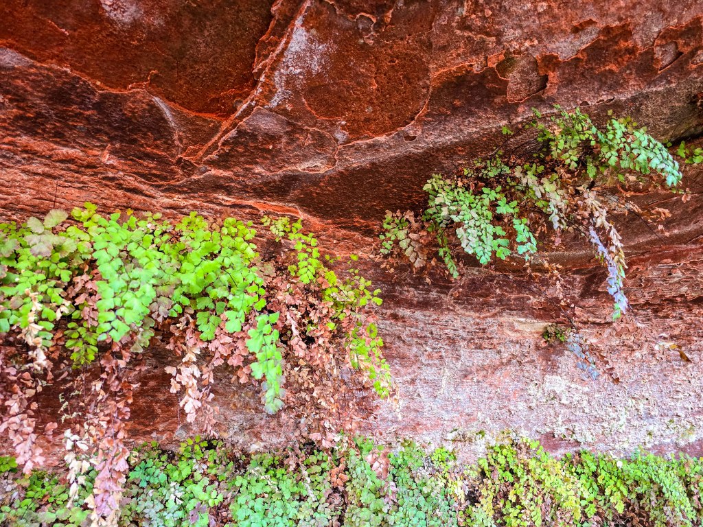 The trail takes you to a unique spring that comes out of the sandstone rock. It seeps from the sandstone giving a constant water flow for ferns to live attached to the rock. I wonder how these ferns even got there to grow. They aren’t found in the desert so why are they there???