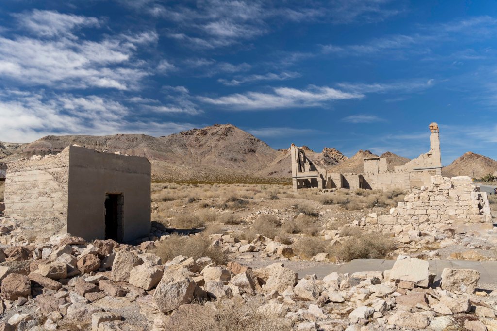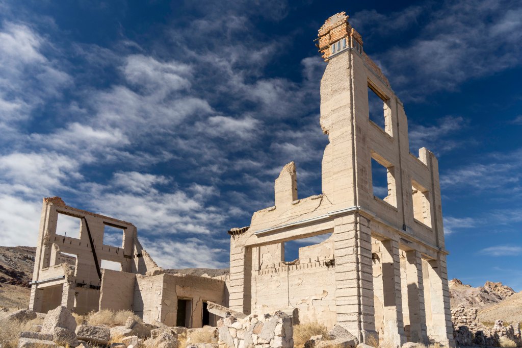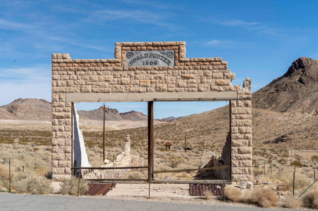 A gold rush to the area grew Rhyolite’s population from a mining camp of two tents in 1904 to 10,000 people in 1907. With the gold ore playing out, the population had declined to 675 in 1910.
