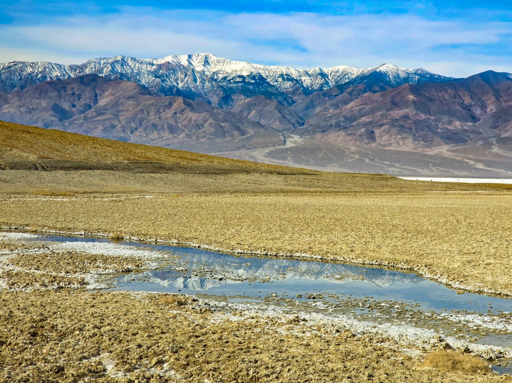From there I drove further down the road to lowest point of Death Valley – 282 feet below sea level. The view of the basin and the mountains was so beautiful. I loved how the pools of shallow water reflected the snowy peaks of the mountains.