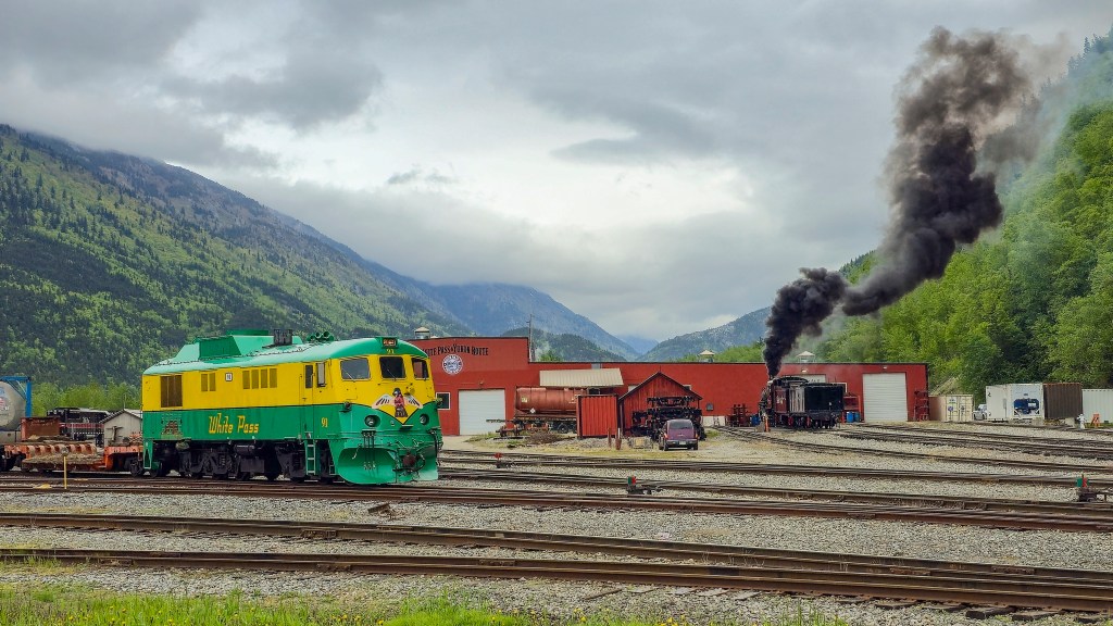 It took you by the main railyard of the White Pass & Yukon Railroad. I love that they had an old steam engine firing up while a more modern locomotive was driving past.