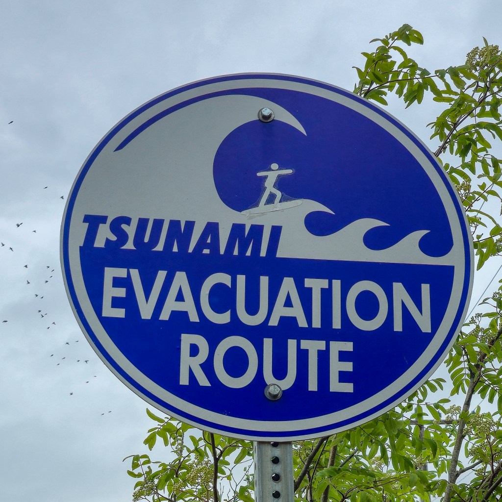 I came across this tsunami evacuation route sign. Someone was pretty clever adding a surfer to the large wave 🙂